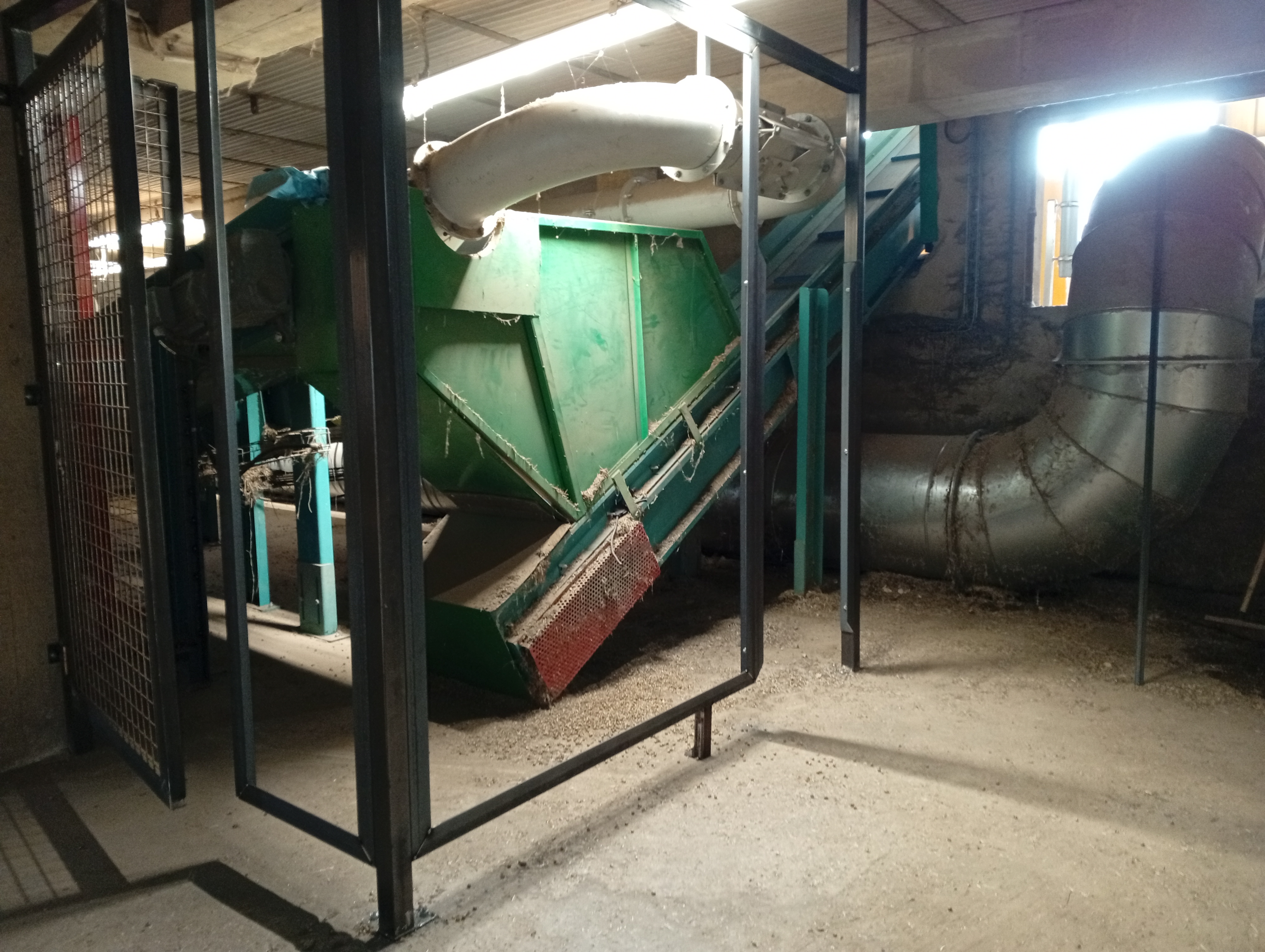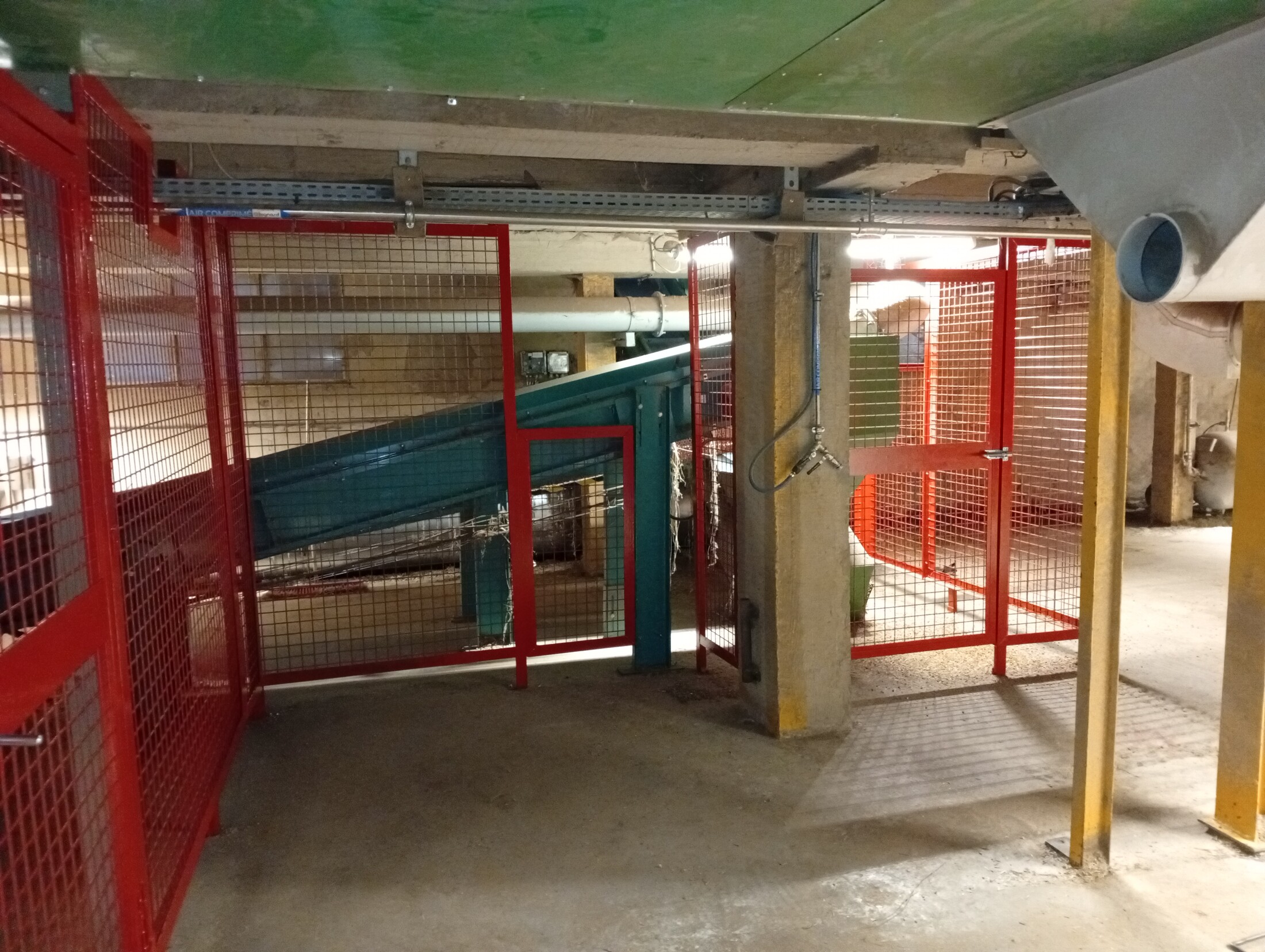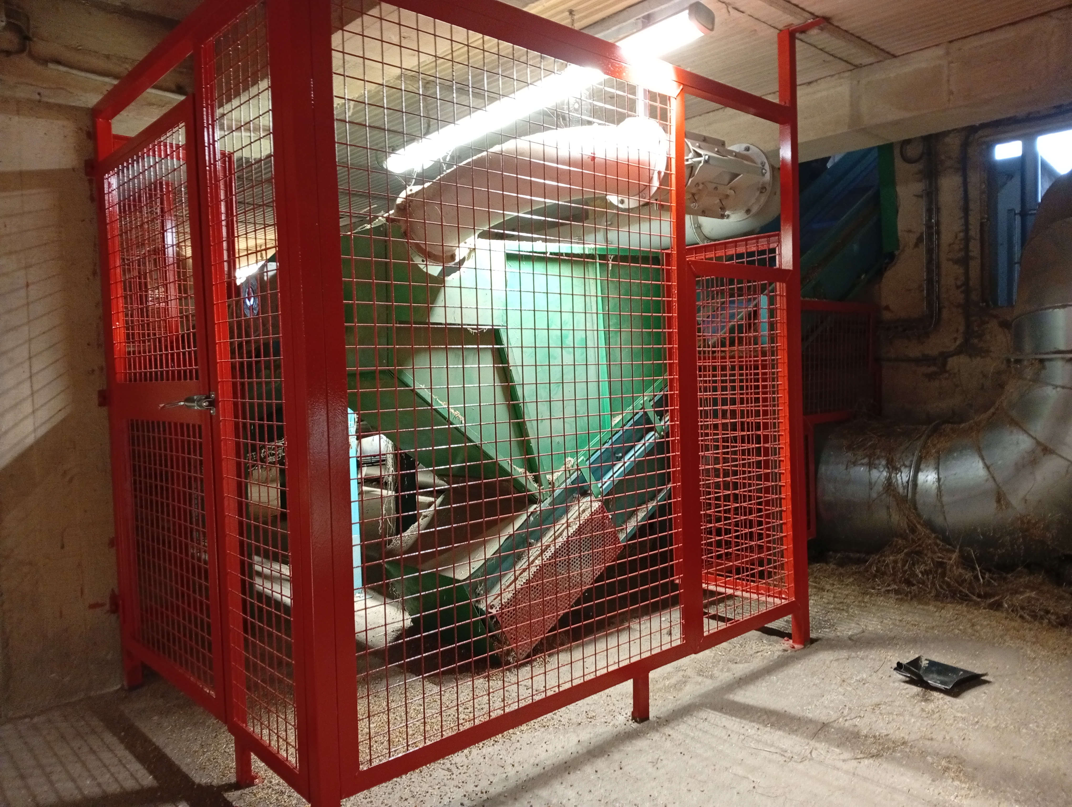 Exemple de carters de protection pour des machines de ligne de production d'une coopérative spécialisée dans la culture et la transformation du lin textile située à Vittefleur (76). Cloison munie de porte d'accès afin de protéger le personnel travaillant sur site. Peinture effectuée par nos soins.